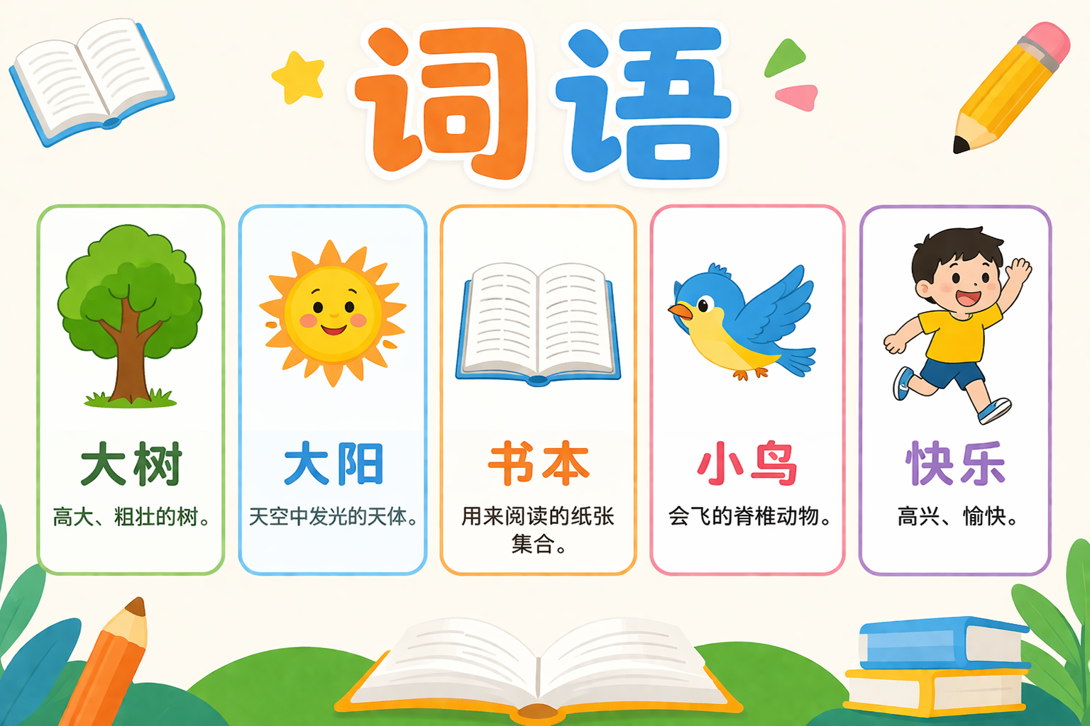 - 词语卡片:正面写词语,背面写意思和例句