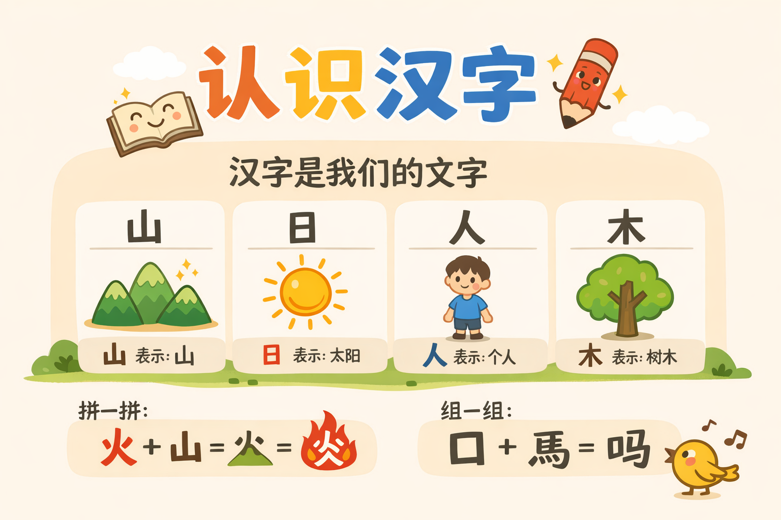 汉字是记录汉语的文字。学好一年级汉字,重点是会认、会读、会写、会用,为阅读和写话打基础。