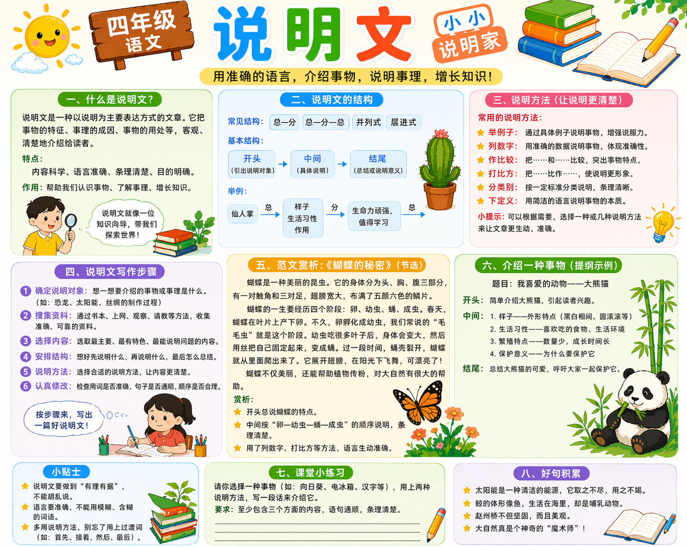 说明文是用清楚、准确的语言介绍事物或讲明道理。四年级重点是说明清晰、条理有序。