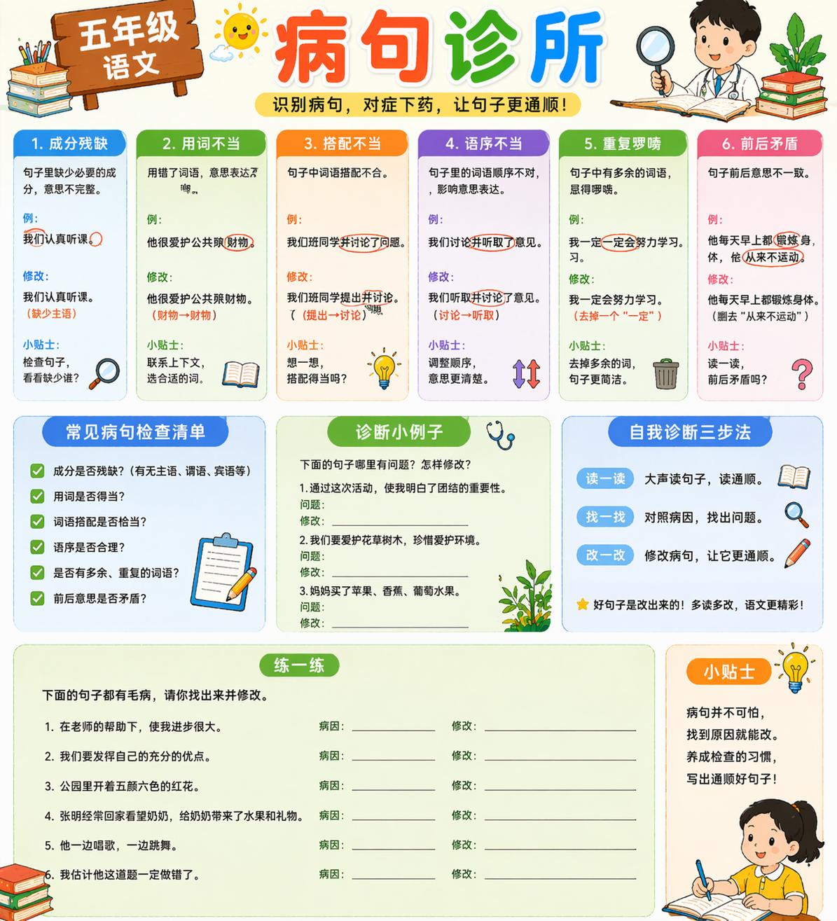五年级病句学习重点是发现错误、知道原因、能改正确。