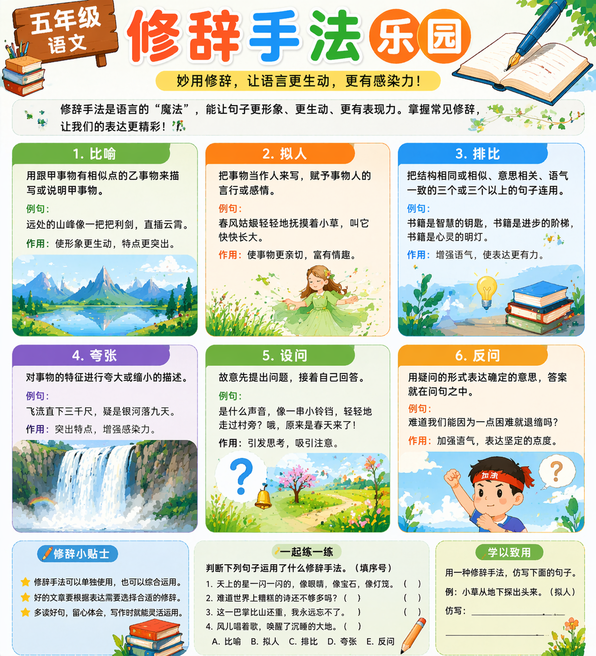 五年级修辞重点是理解修辞作用、准确运用、提升表达效果。