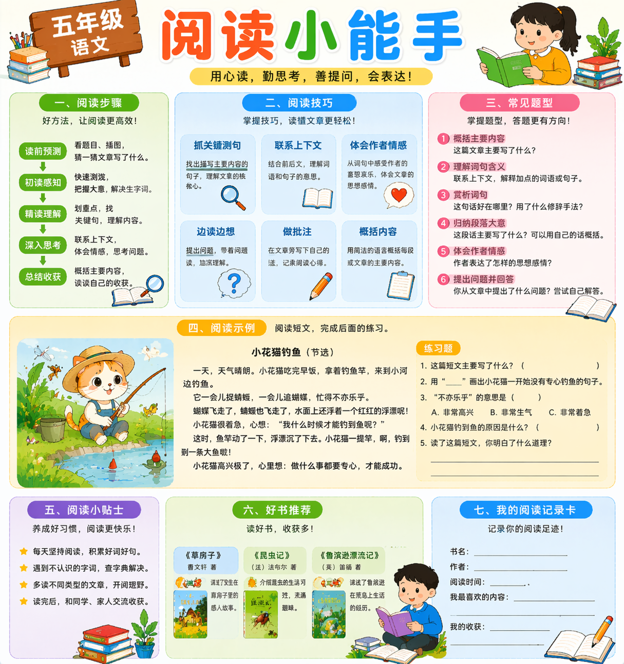 五年级阅读重点是理解文章结构、抓住中心思想。