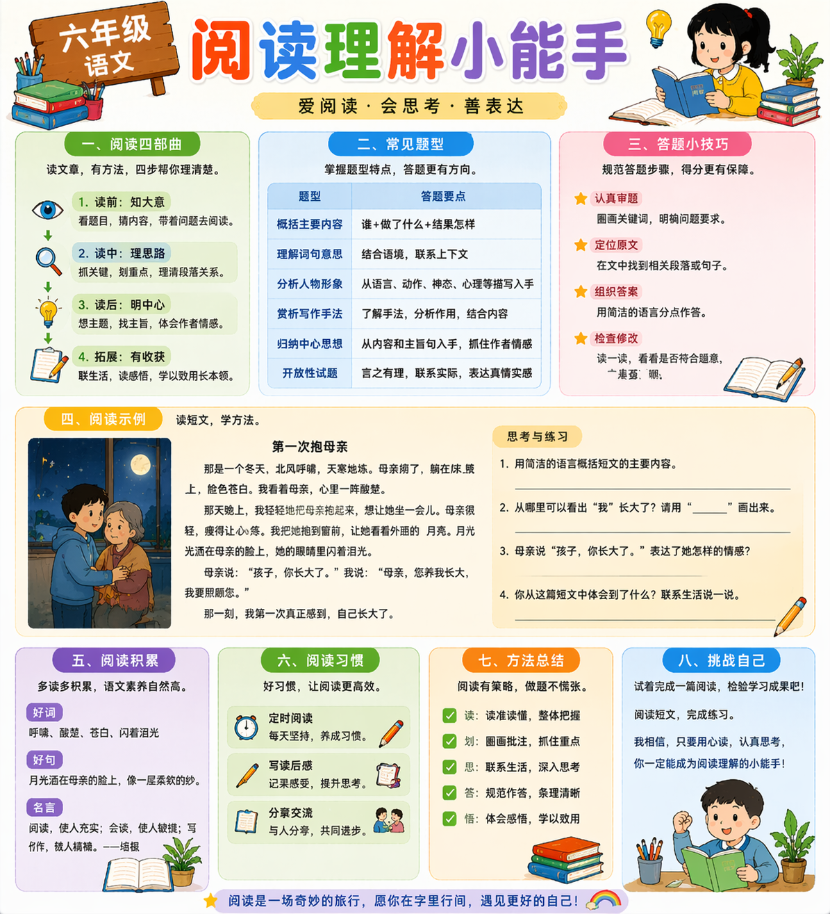 六年级阅读重点是理解主旨、分析写法、体会情感。