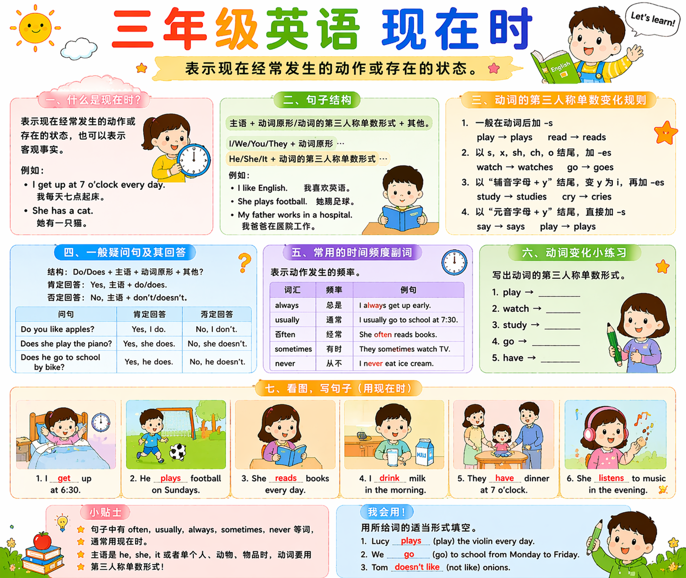 三年级现在时重点是理解习惯动作、会用动词变化。