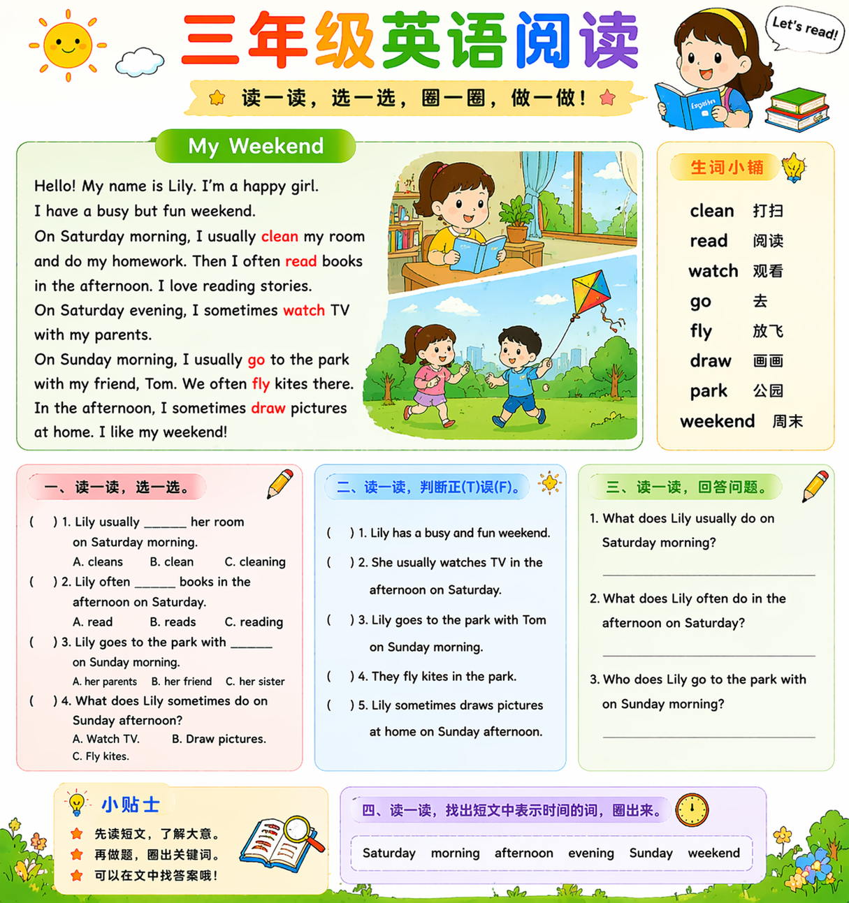 三年级阅读重点是读懂句子、理解大意。