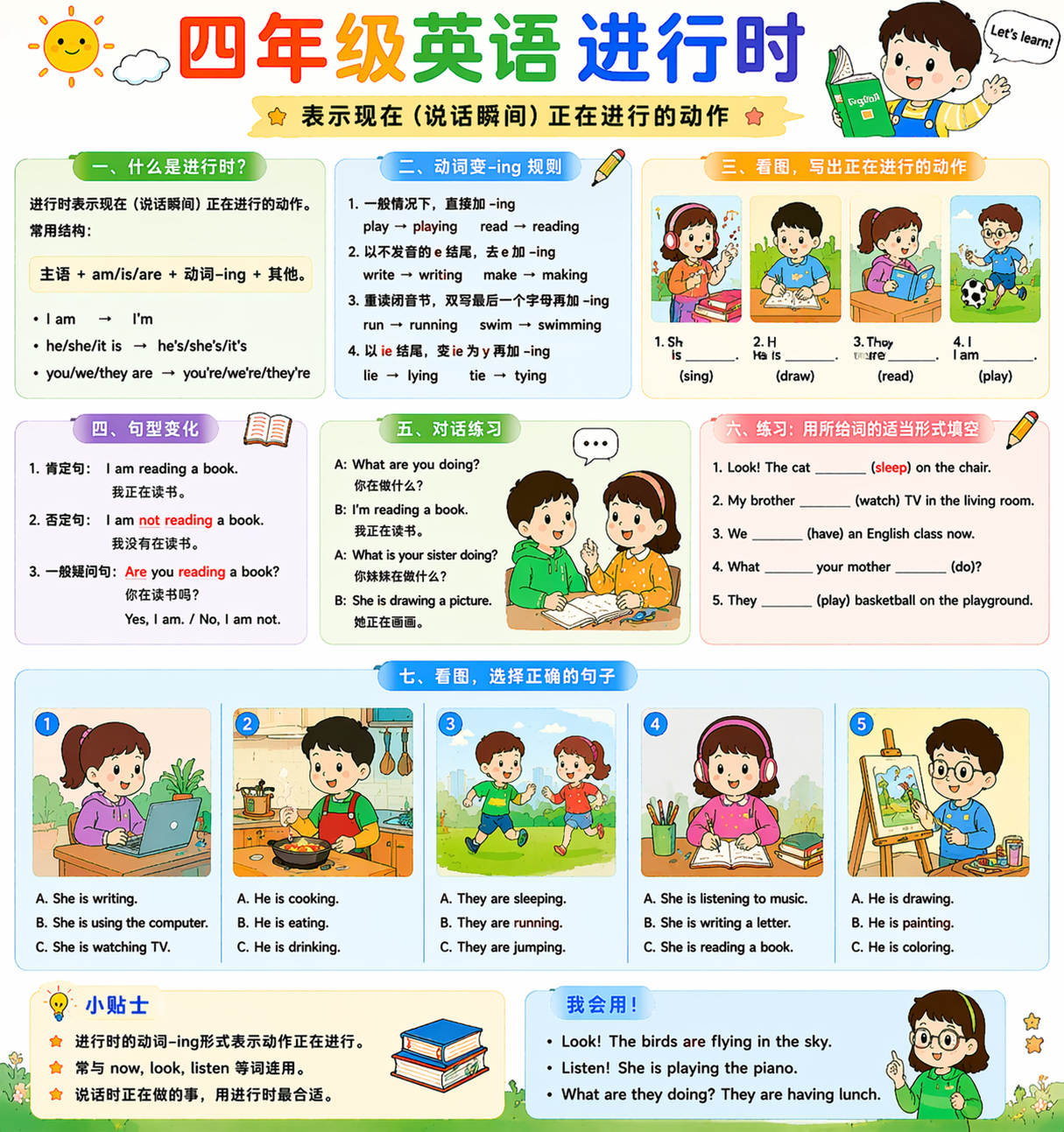 四年级进行时重点是会用 be + 动词-ing,描述正在发生的事。