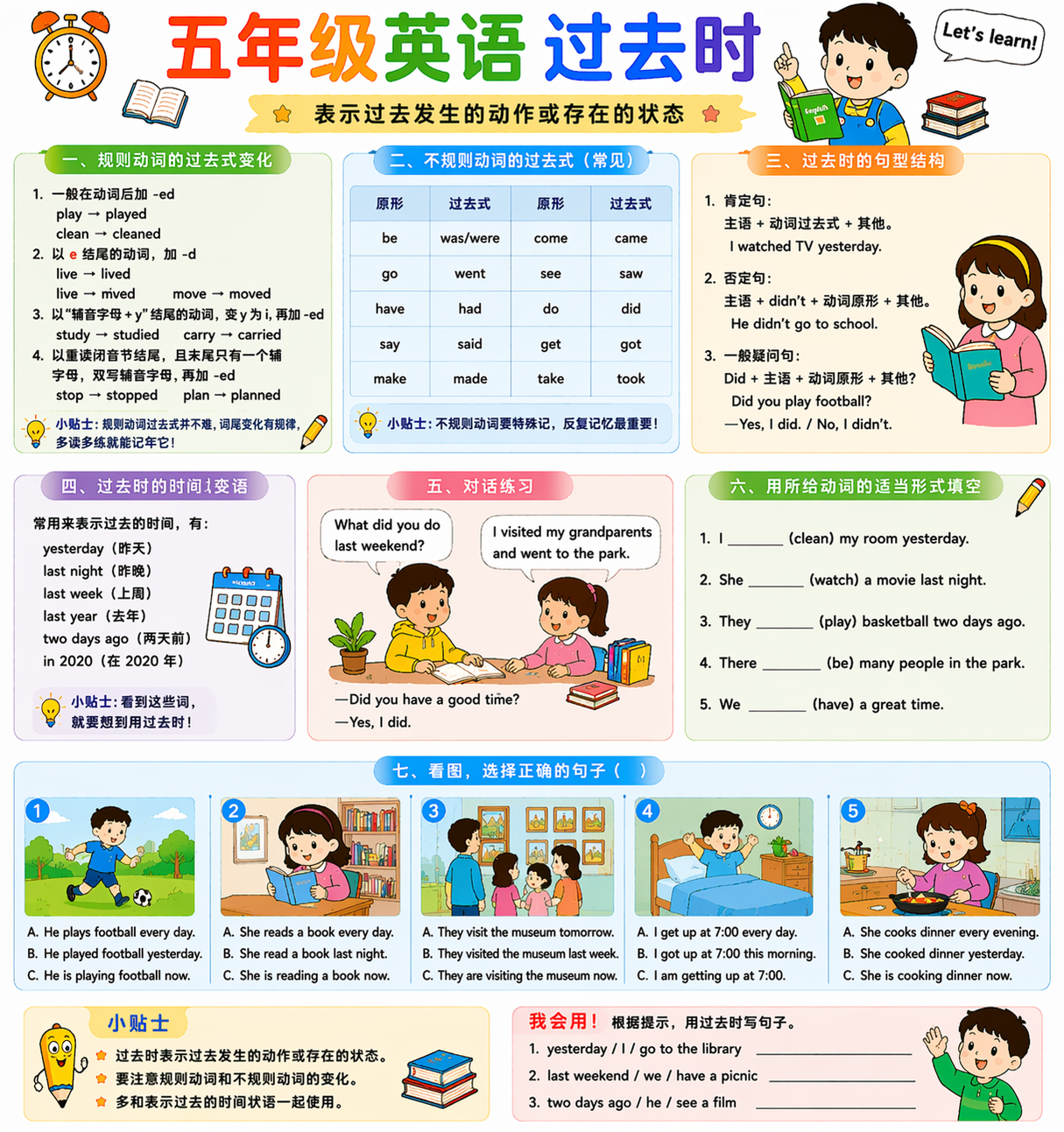 五年级过去时重点是会用动词过去式、能描述过去发生的事。