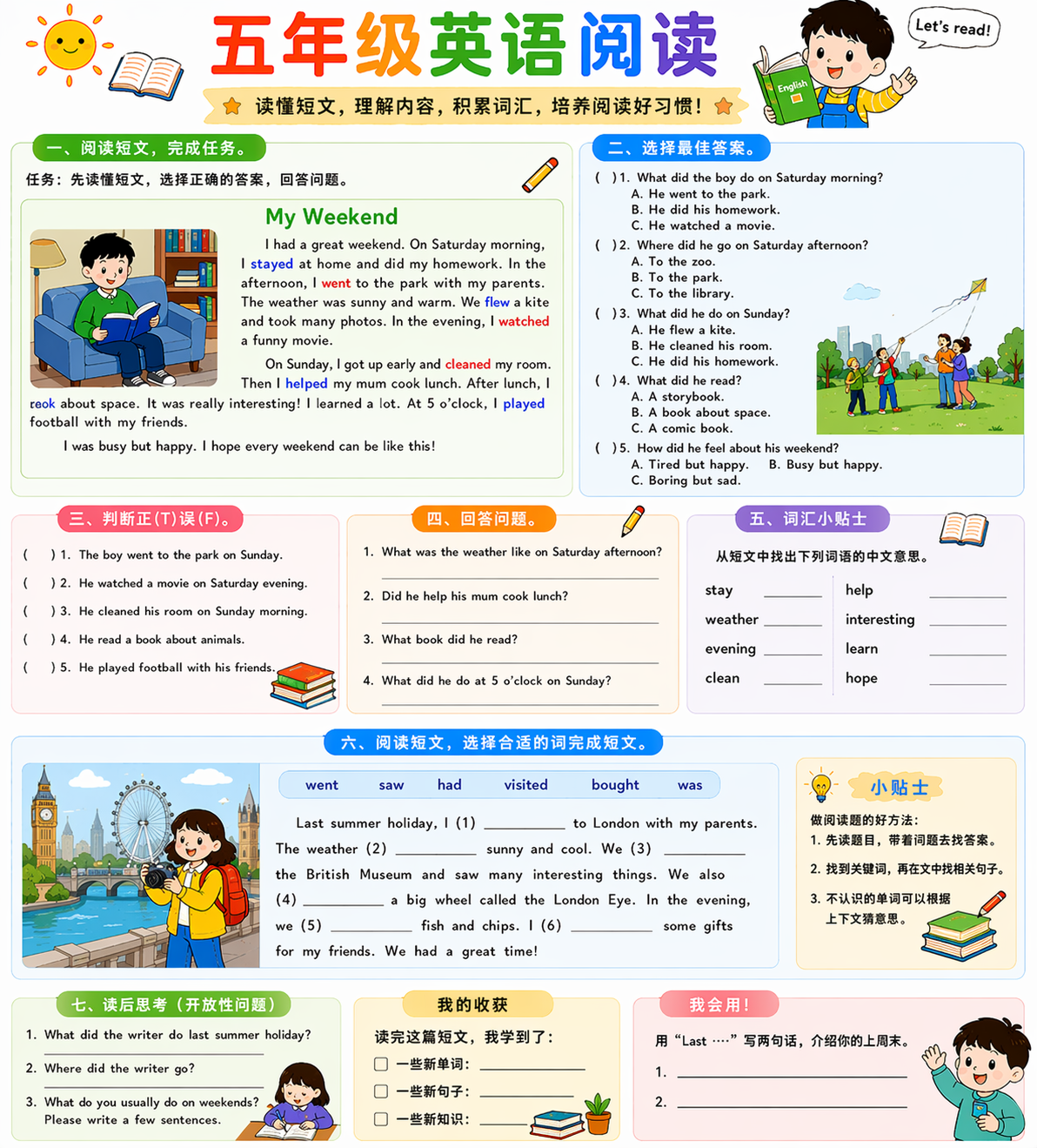 五年级阅读重点是理解段落大意、抓住关键信息。