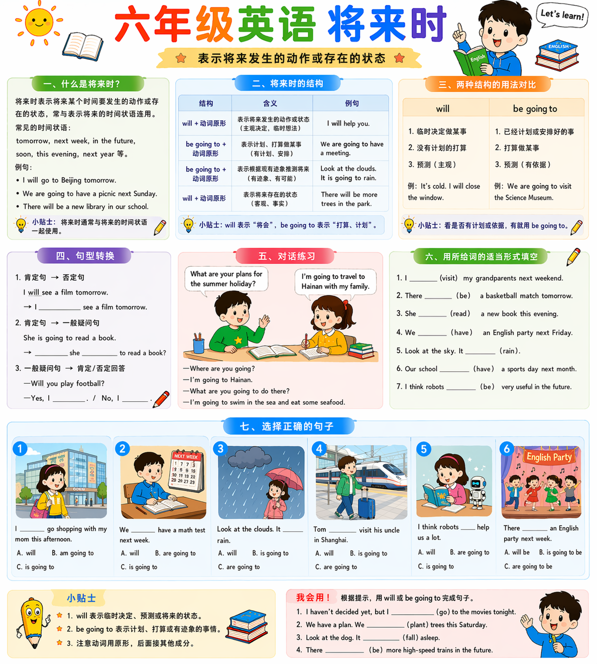 六年级将来时重点是会用 will / be going to 描述将来。
