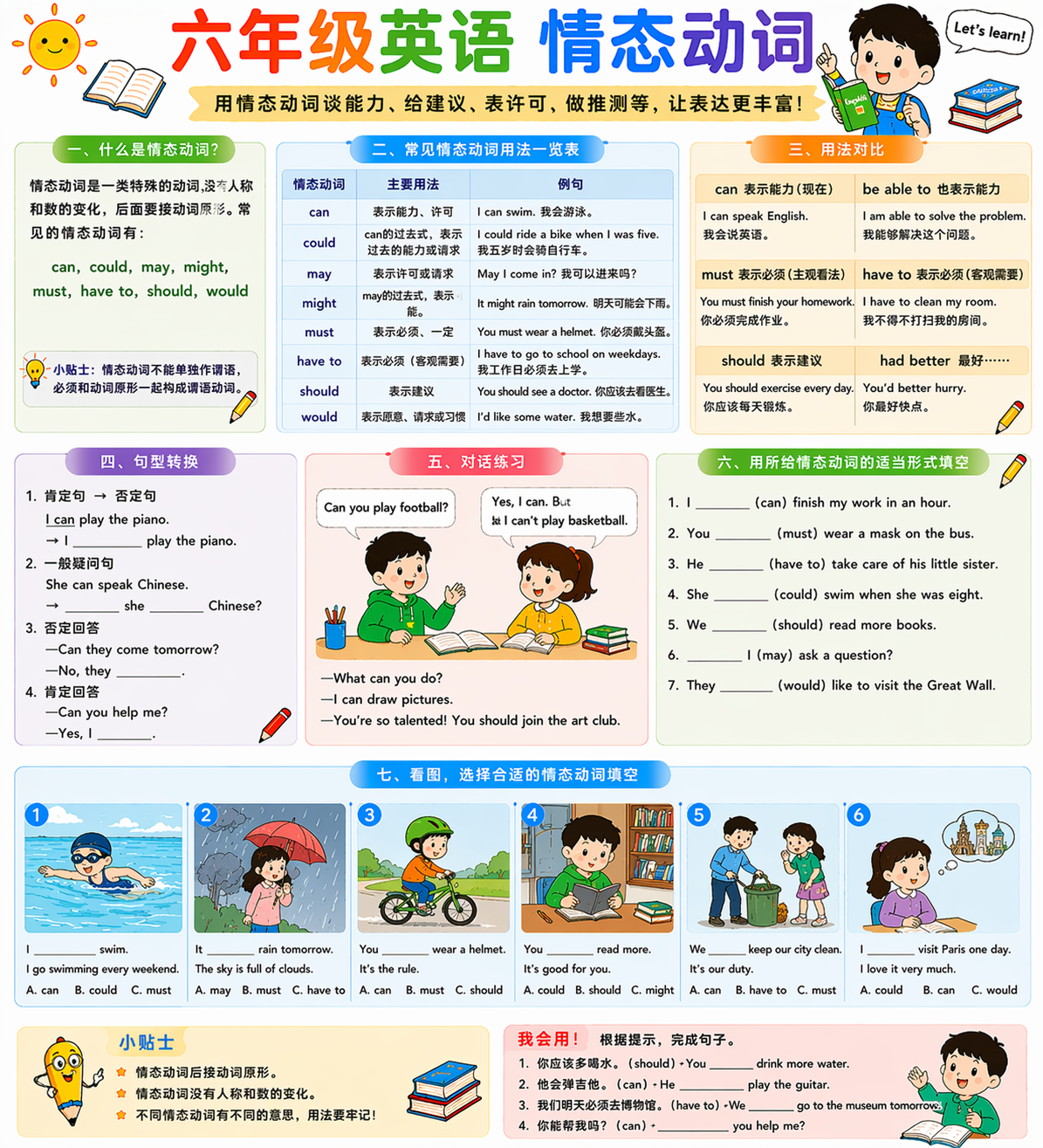 六年级情态动词重点是会用 can/must/should 等表达能力与义务。