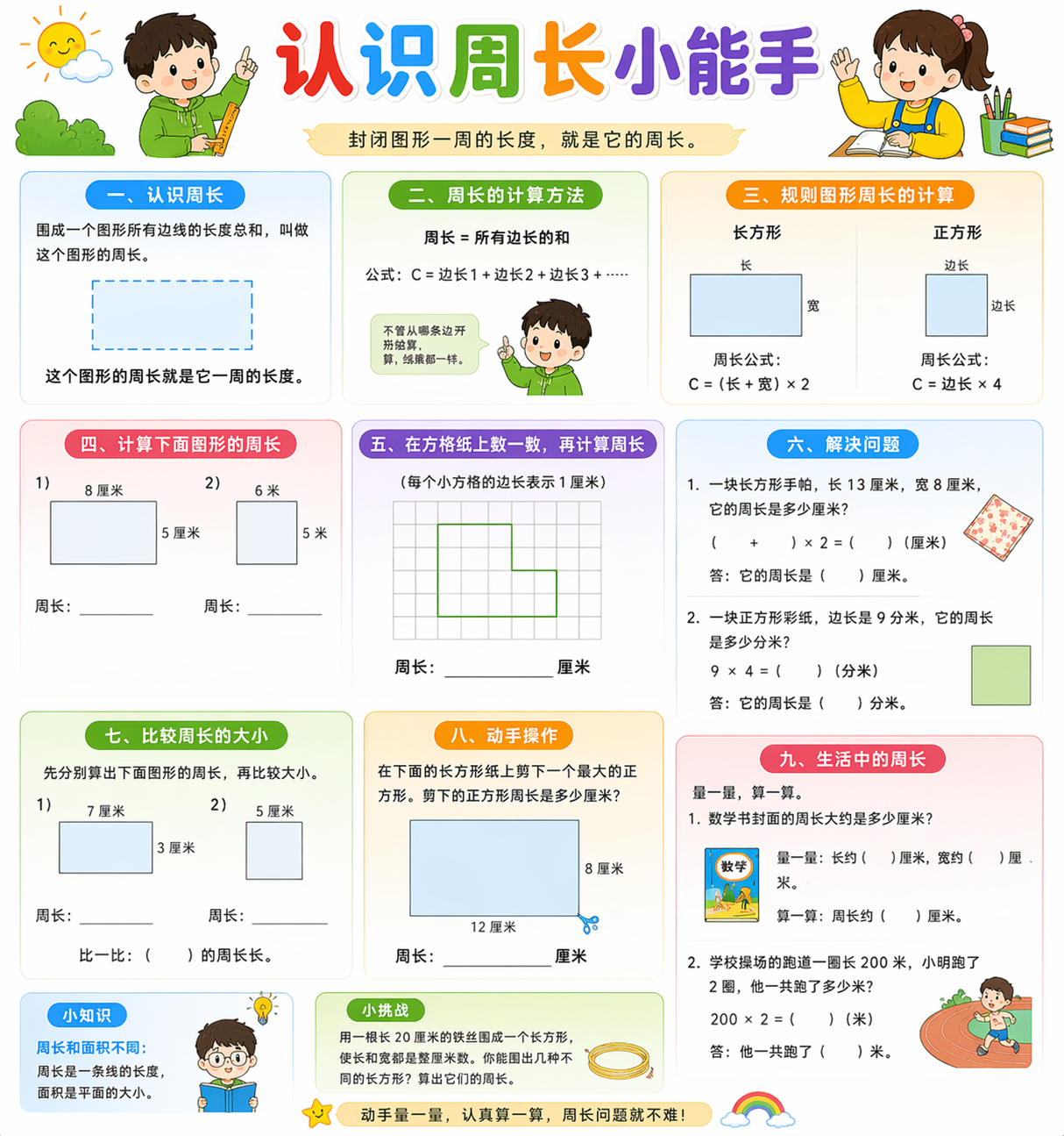 | 周长 / 面积 | 周长是边的总长 | 面积是面大小 |