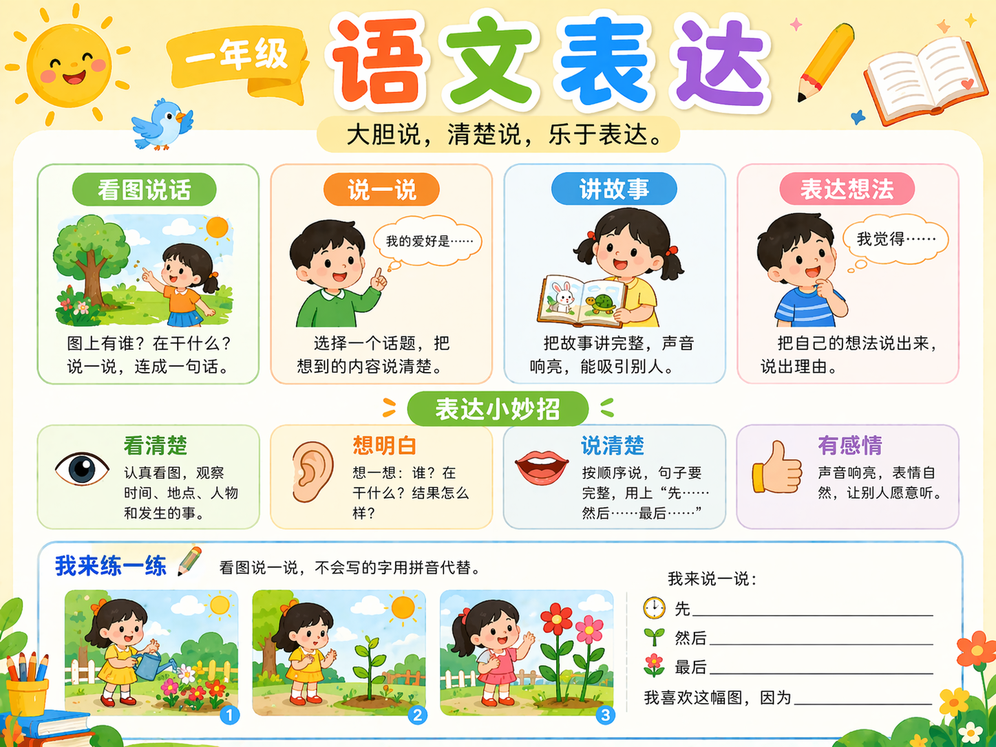 表达是把想法说清楚、写清楚。一年级表达重点是敢说、会说、说得清。