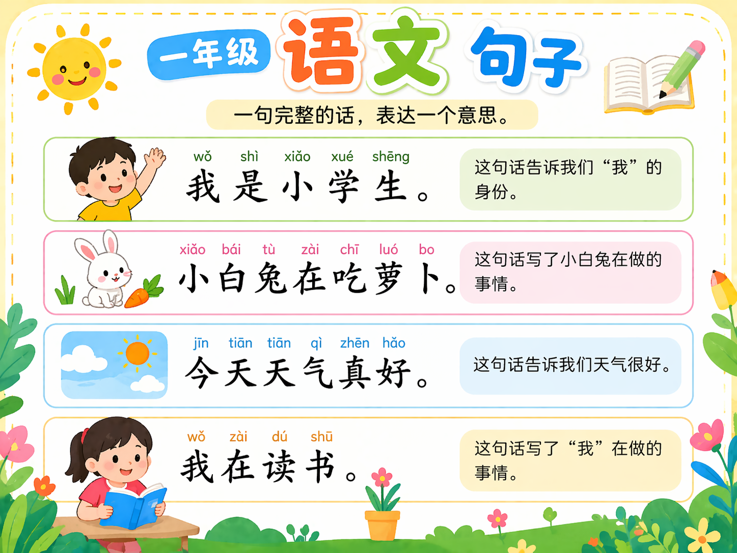 句子是表达完整意思的一段话。学好一年级句子,关键是有主语、有动作、意思清楚。