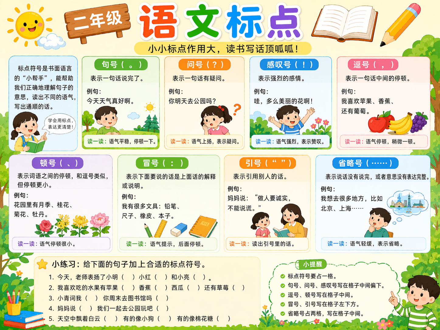 标点符号帮助句子更清楚。二年级重点是会用、用对、用整齐。