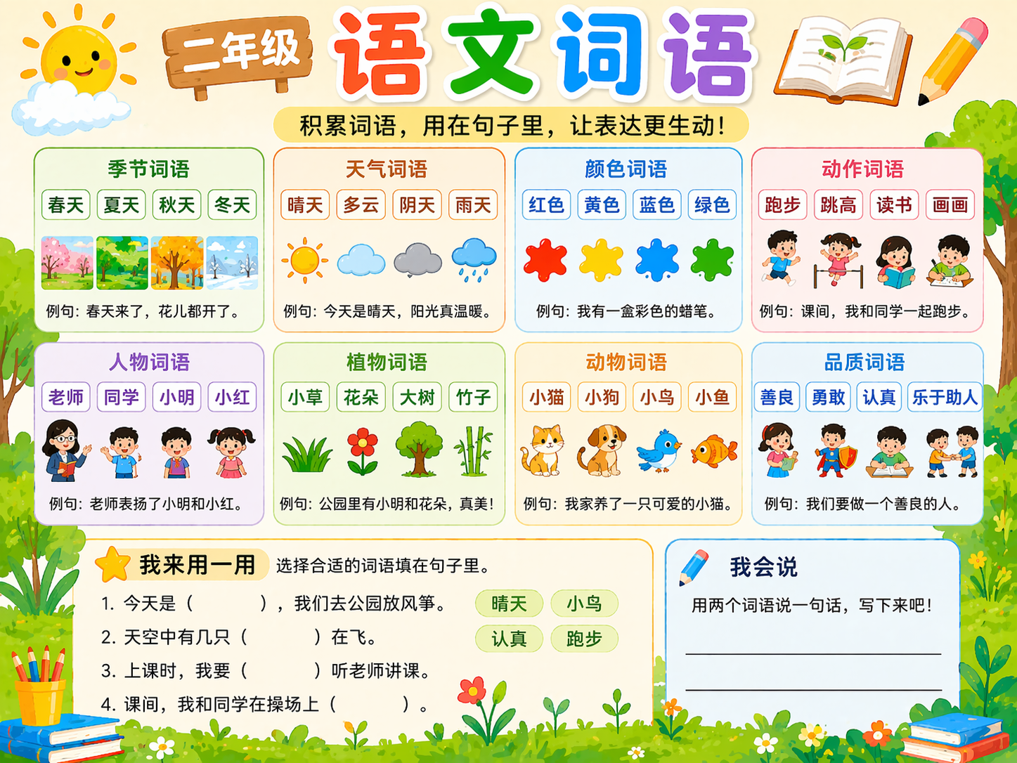 二年级词语学习重点是理解意思、会用、会积累,能在说话和写话中自然使用。