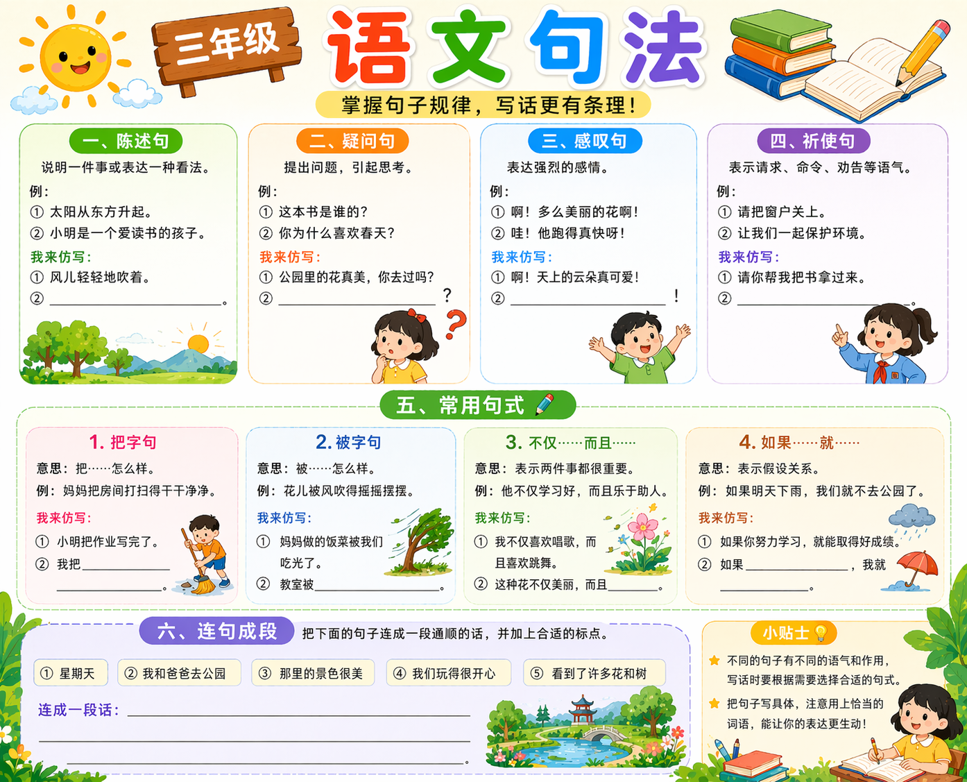 三年级句法学习重点是句子更完整、结构更清楚。