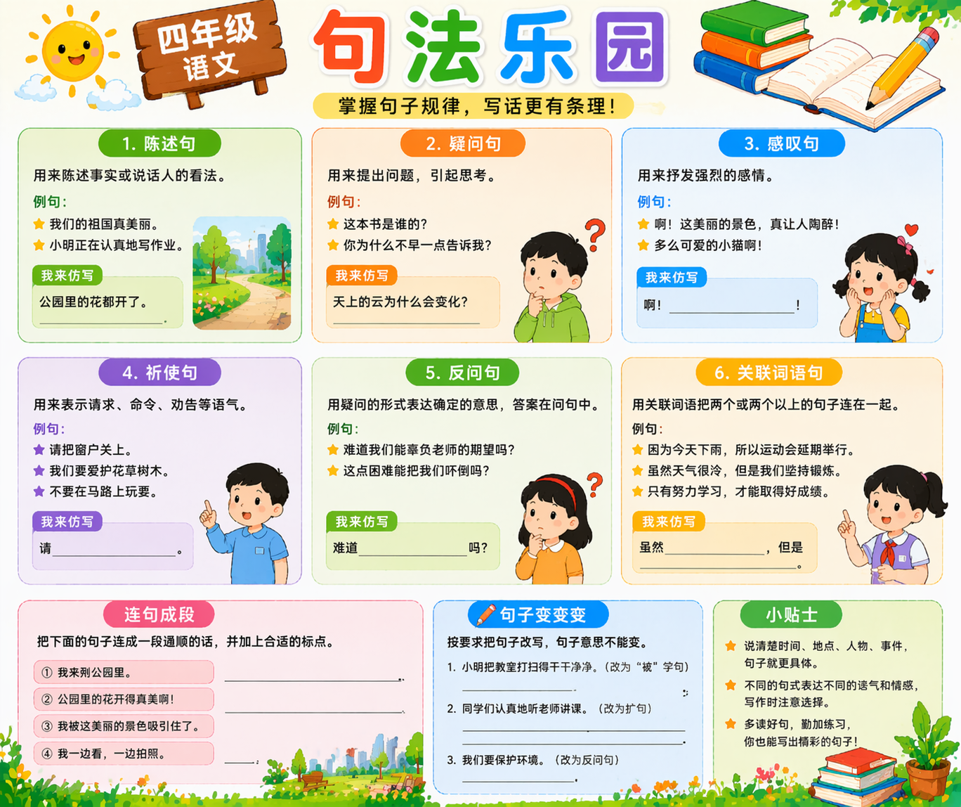 四年级句法学习重点是结构清楚、表达连贯。