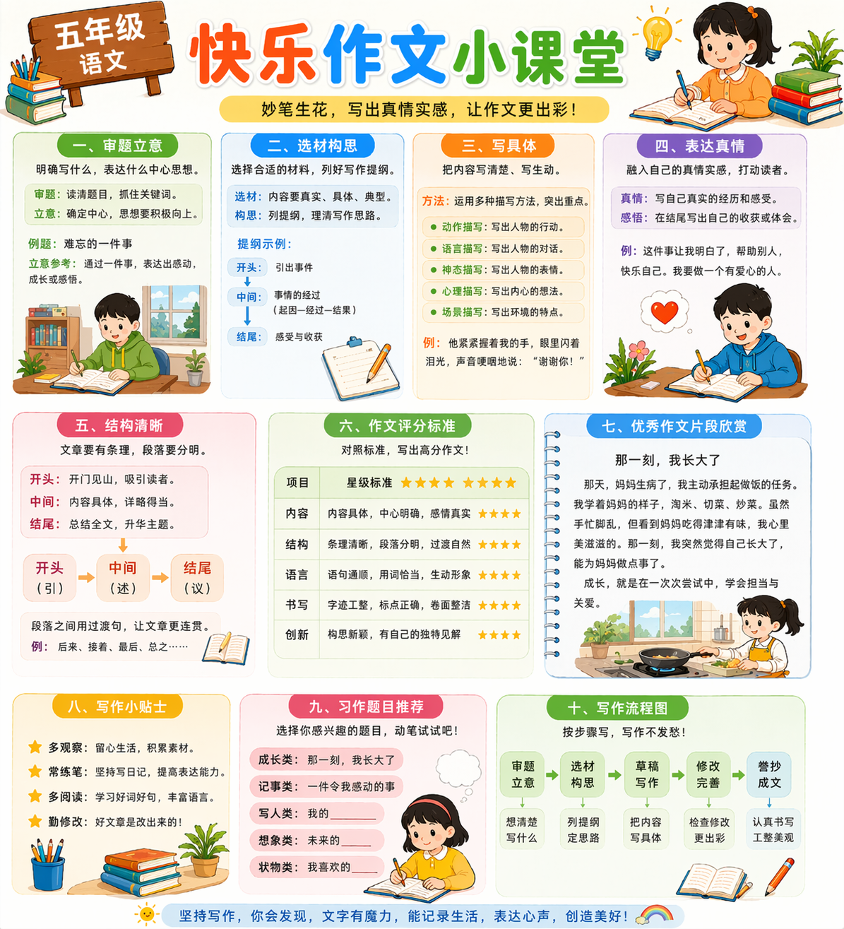 五年级作文重点是结构清晰、细节充实、情感真挚。