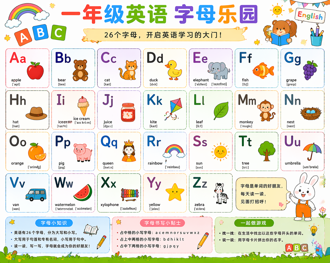 一年级英语字母重点是会认、会读、会写。