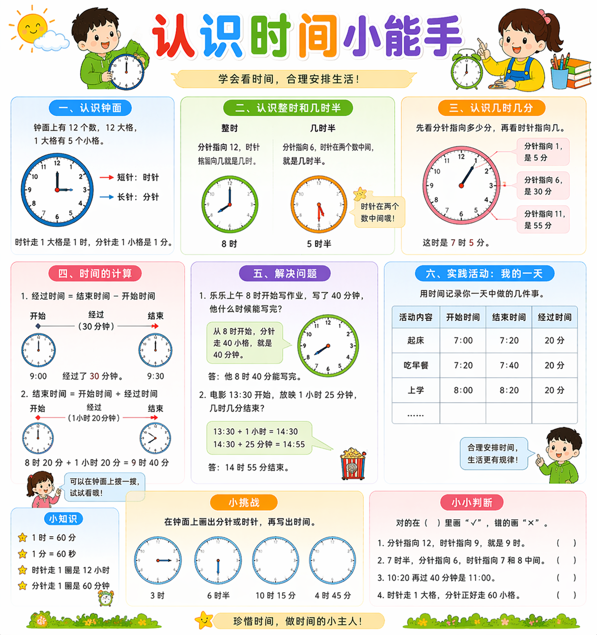 三年级时间学习重点是读钟表、换算单位、解决时间问题。